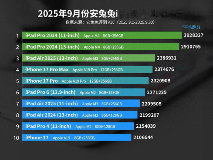 今天分享的是2025年9月份iOS设备性能榜,其中最大的看点是iPhone17系列,这也是写这篇文章的主要目的。其中iPhone Air跌出前十,iPhone17排名第十,最大的黑马是iPhone17Pro系列,以230万+的平均成绩排在第四名和第五名。